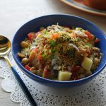 In serving plate,add papri,dumplings,chickpeas,potato,tomato,onion,salt,red chili crushed,chaat masala,cumin seeds,lemon juice,green chutney,date tamarind chutney,yogurt,chickpeas,papri,potato, tomato,onion,sev nimco,yogurt,green chutney,date tamarind chutney,green chutney,red chili crushed, salt,chaat masala,fresh coriander & serve!