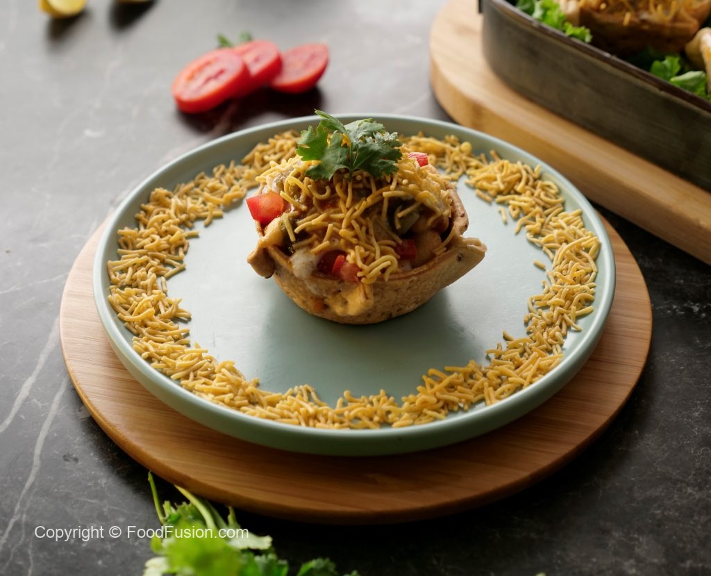 On dough pocket,add bhondi,chaat masala,potato,tomato,onion,spicy hari chutney,imli ki meethi chutney,prepared yogurt,chaat masala,red chilli powder,sev nimco & serve!