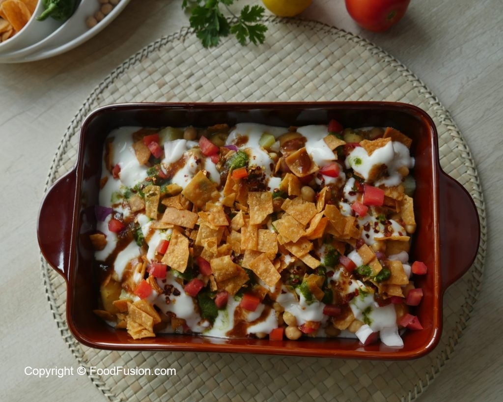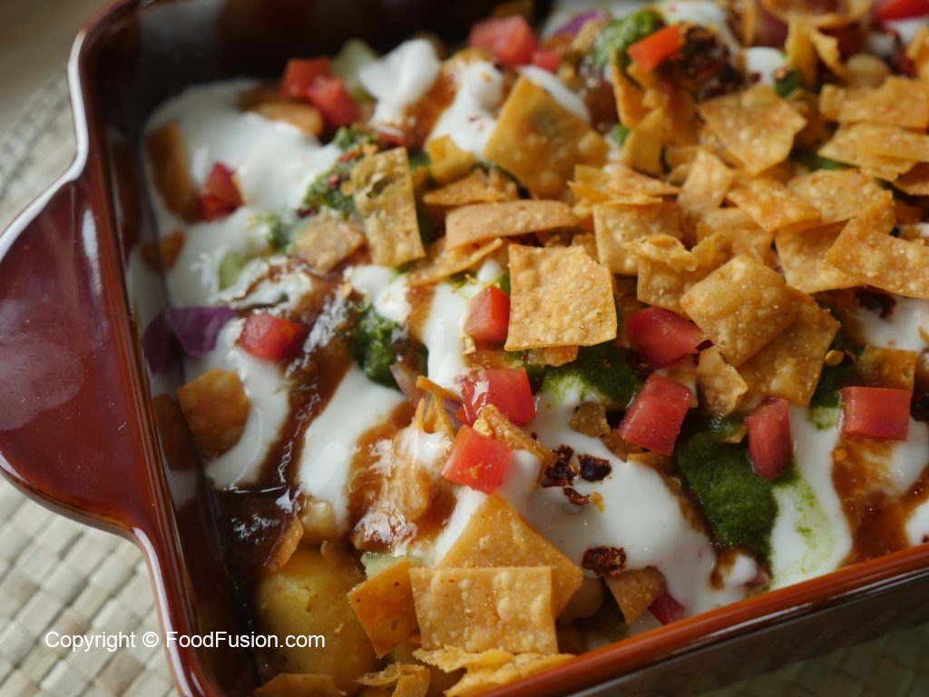 Serving dish mein dahi,phulkiyan,lal mirch crushed,chaat masala,aloo,chanay,tamatar,pyaz,meethi chutney,hari chutney,papri,dahi,meethi chutney,hari chutney,lal mirch crushed,tamatar aur papri dal ker serve karein!