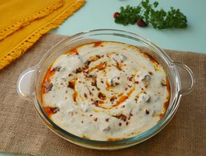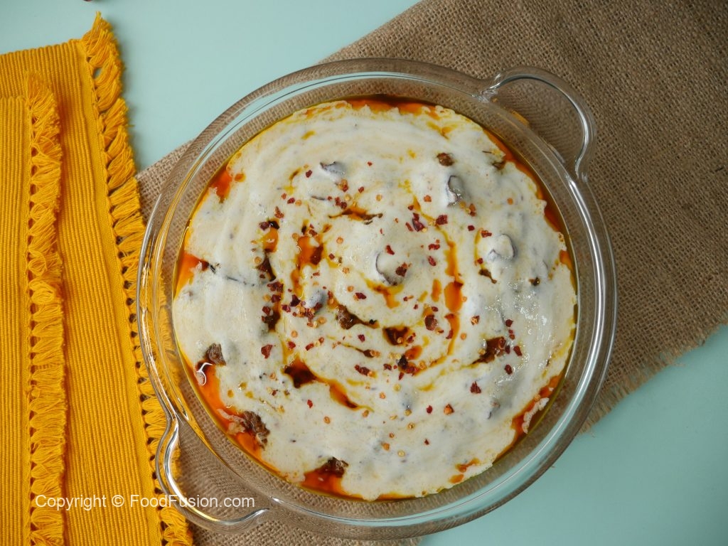 In serving dish,add prepared gravy,fried eggplants and prepared yogurt.