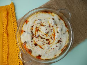 Repeat the layers alternatively until you reach the edge of the serving dish.