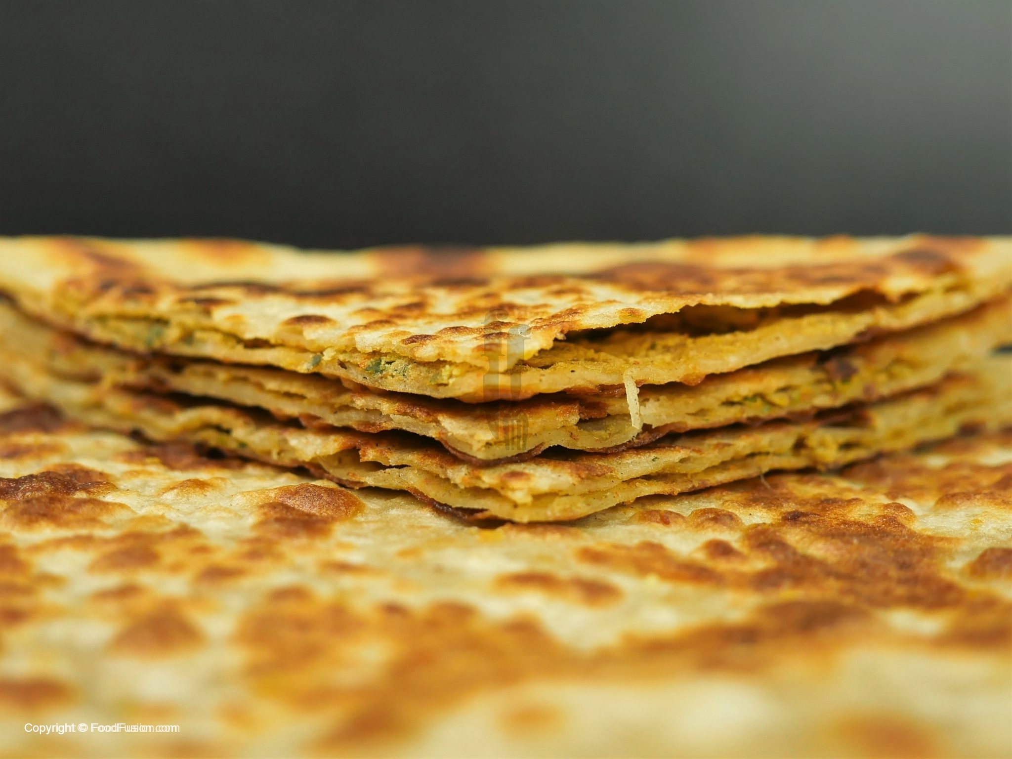 Dough ki small balls bana lein,dough ko haath ki madad sa pheela lein aur filling rakh ker upper sa dosra dough rakh dein,edges ko press ker lein,atta mein dust ker ka rolling pin ki madad sa bail lein.