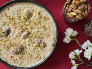 -In a serving dish,add prepared custard,fried samosa patti mixture,prepared custard,fried samosa patti mixture,prepared custard & garnish with fried samosa patti mixture & pistachios.