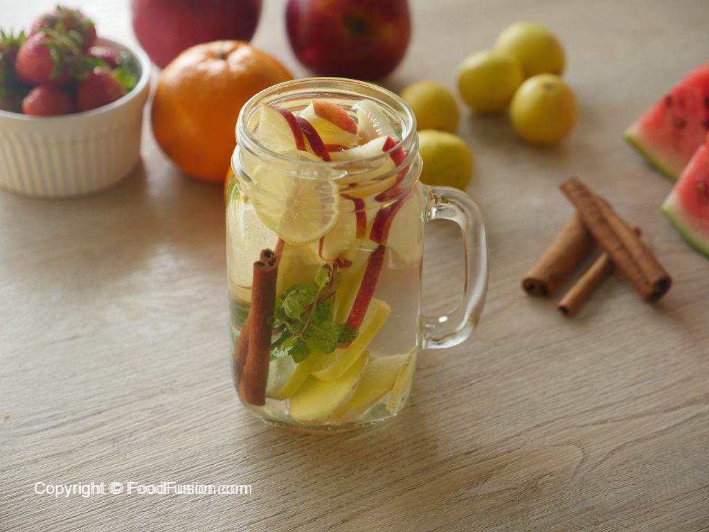 In jug,add mint leaves,ginger,cinnamon sticks,lemon slices,apple,cold water,stir & cover.