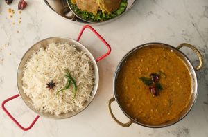 Dish out rice, daal, garnish with fresh coriander, kababs & serve with salad.