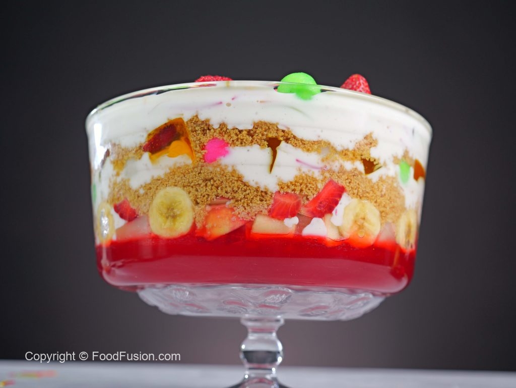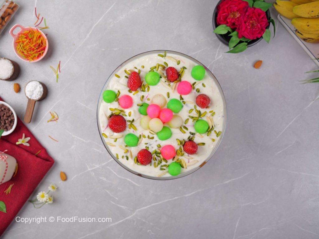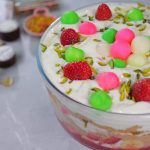 -Make another layer of mix fruits, biscuit crumbs, prepared custard, garnish with colourful sweets, almond, pistachios, strawberries & serve!