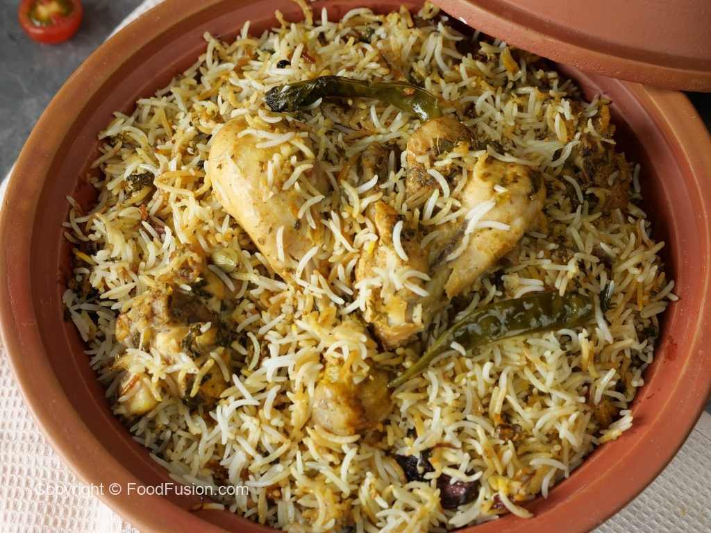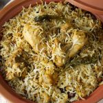 -In a cooking pot,spread thin layer of rice,marinated chicken,remaining boiled rice,garam masala powder,mint leaves, fresh coriander,fried onion & clarified butter.
