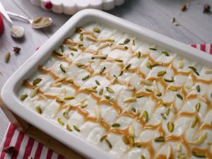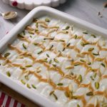 -Add prepared thick milk,pistachios,almonds,caramel sauce,soaked bread slices,thick milk, pistachios,almonds,caramel sauce,soaked bread slices & thick milk.