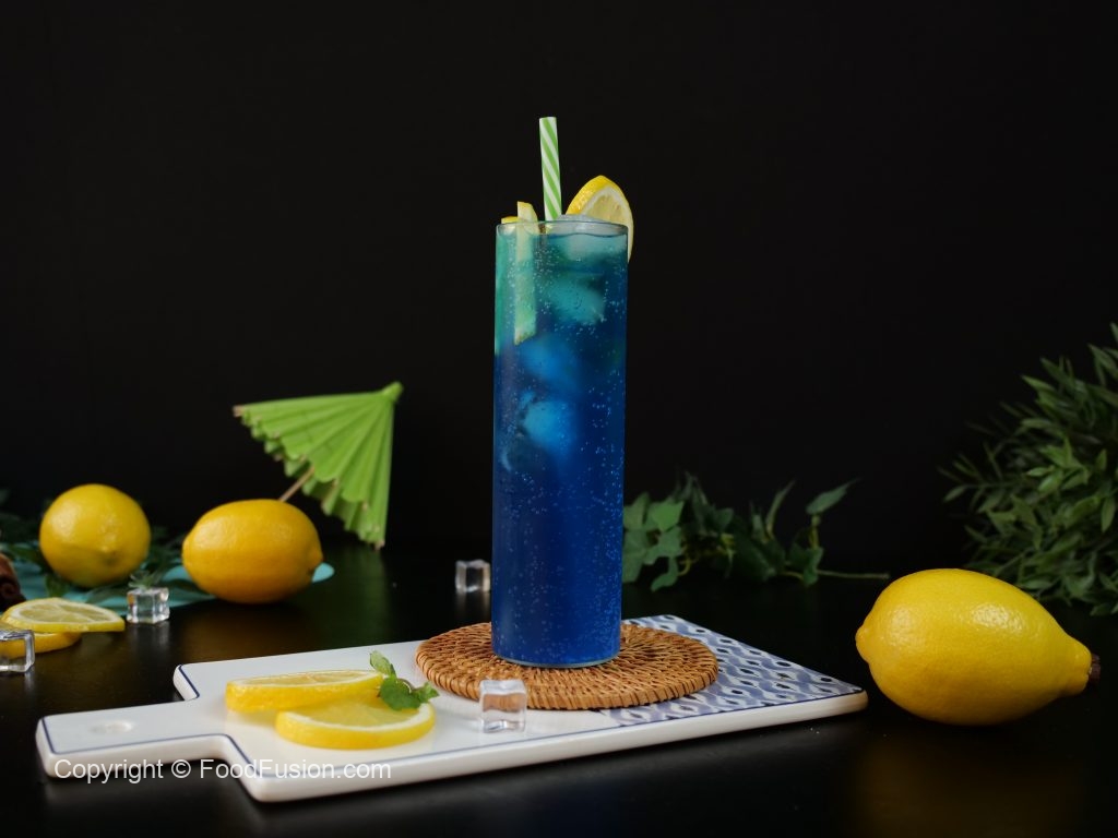 -In a serving glass,add ice cubes,lemon slices,7up,prepared blue curacao syrup (2 tbs) & stir well.