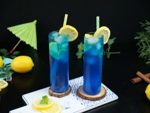 -Serving glass mein ice cubes,lemon slices,7up & tayyar blue curacao syrup (2 tbs) dal ker ache tarhan stir ker lein.