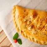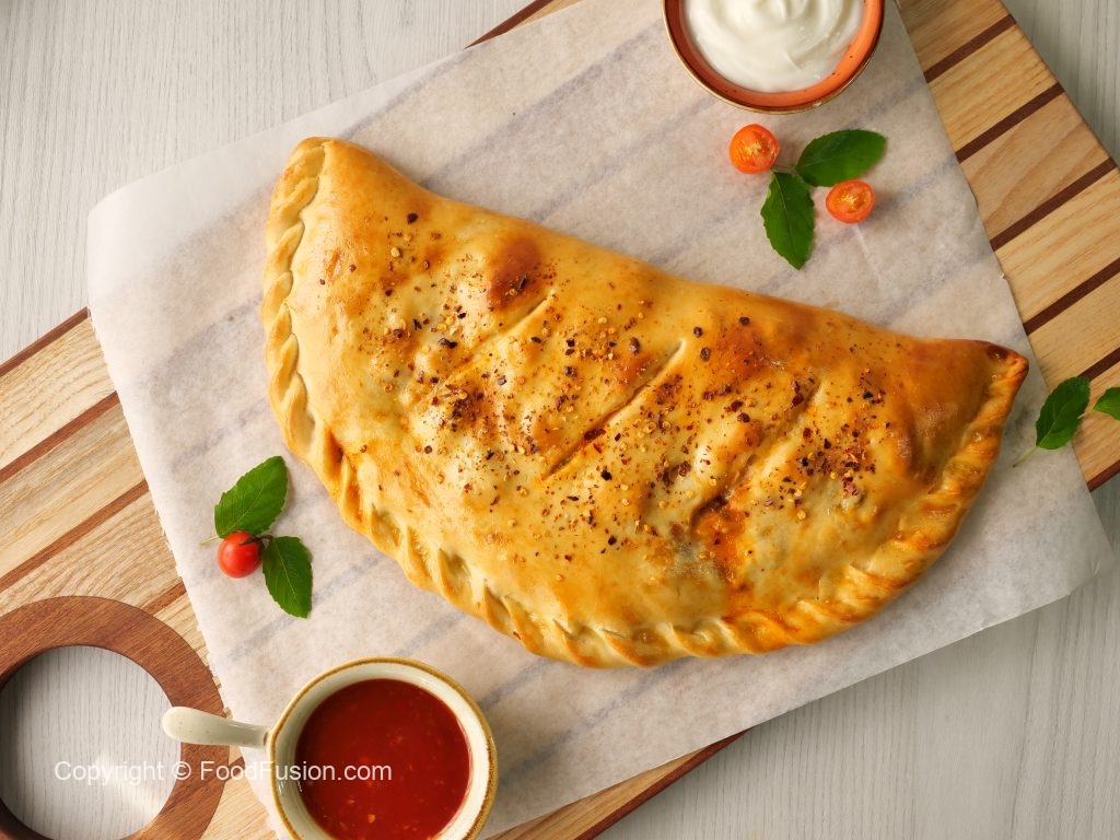 -On baking tray,place prepared calzone & with the help of the knife slightly add marks on the surface,apply egg wash & sprinkle red chilli crushed (makes 2).