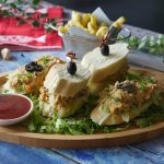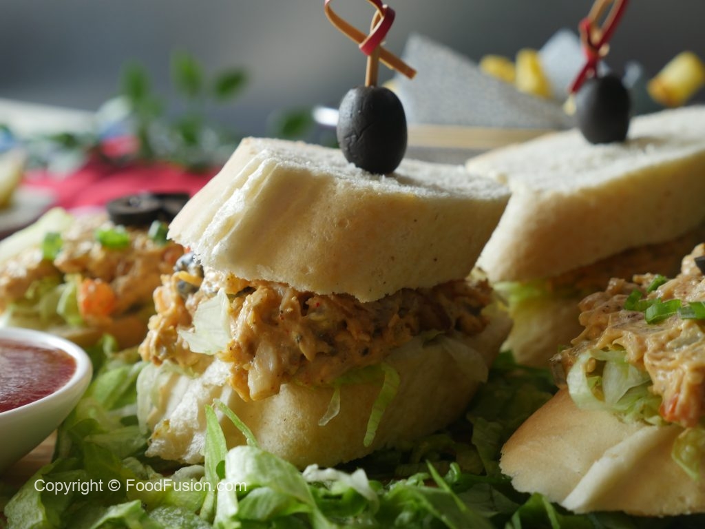 On french bread slice,add iceberg lettuce,prepared fish filling and place another french bread slice on top and & garnish with black olive.