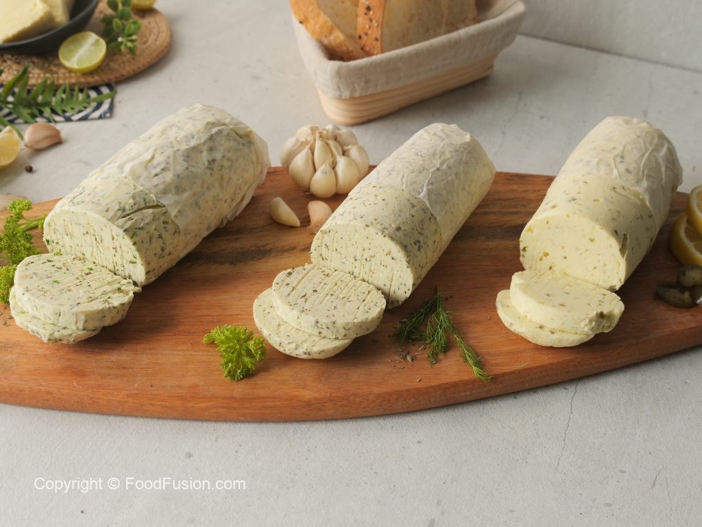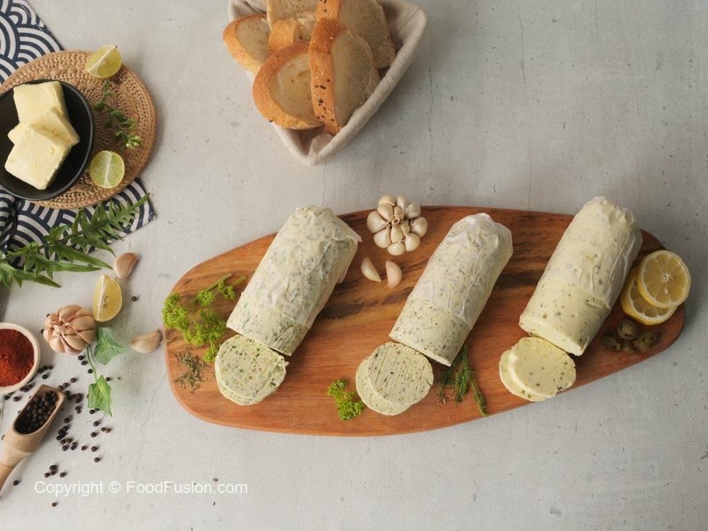 On cling film,add garlic & herb butter,roll out,seal properly and refrigerate for 2 hours.