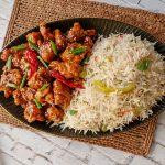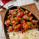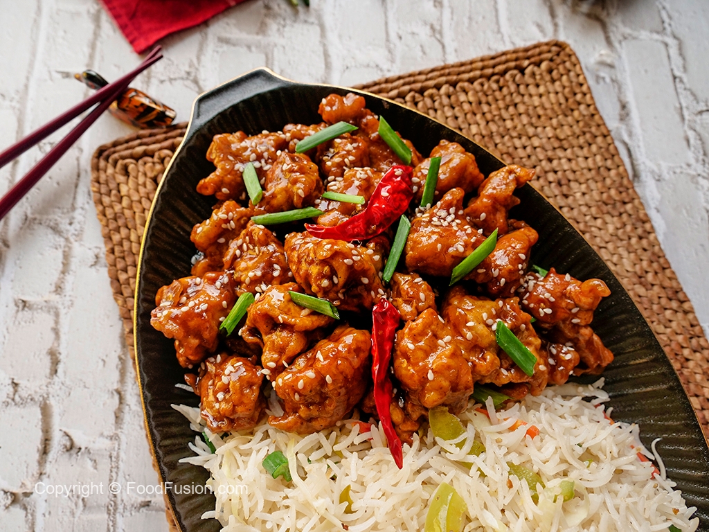Garnish with sesame seeds,green onion leaves & serve with fried rice.