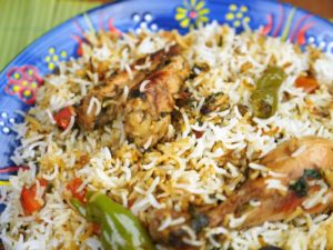 For biryani layering,add chaat masala,whole spice powder,yogurt,mint leaves,green coriander,fried onion,tomatoes,green chilies,boiled rice,fried onion,green coriander,mint leaves,tomatoes,kewra essence and oil.