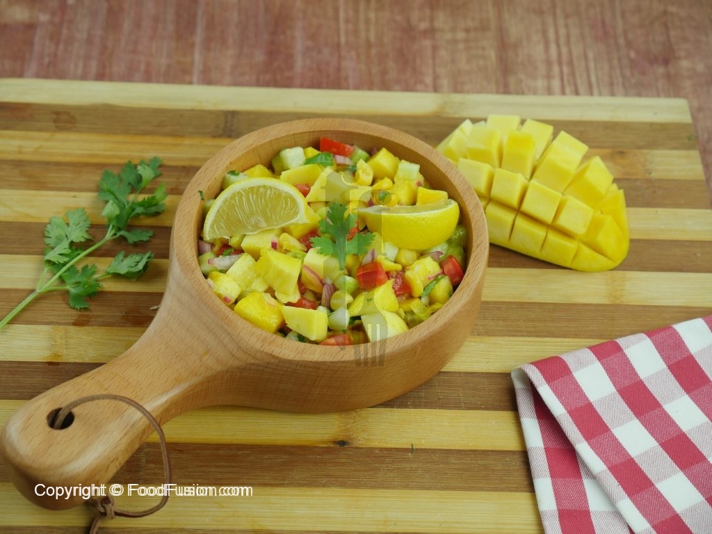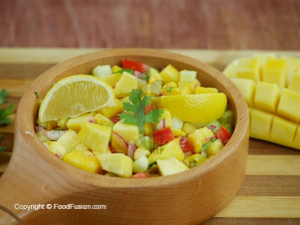 Try this fresh, healthy and nutritious Mango Fusion Salad recipe with a touch of lime pickled onions. Also learn how to beautifully cut a mango.