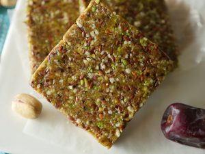 In chopper,add almonds,pistachio,flax seeds,coconut oil,dates and chop until well combined.