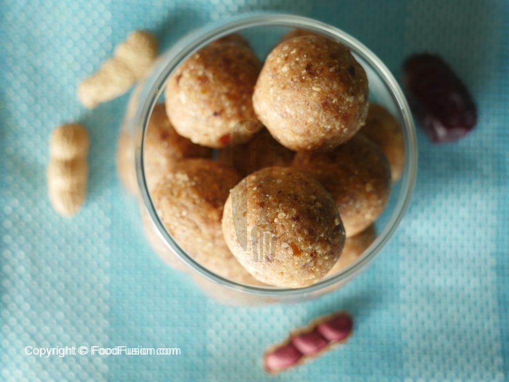 In chopper,add peanuts,desiccated coconut,instant oats,dates,organic peanut butter and chop until well combined.
