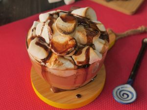In serving cup,add caramel hot chocolate,marshmallows and burnt with blow torch.