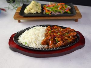 -Grease hot sizzling plate with butter,add rice,hot garlic chicken & serve with mash potatoes & sauteed vegetables!