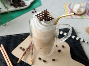 In a serving glass,add ice cubes,prepared tres leches iced coffee,top with whipped cream and garnish with chocolate & serve!