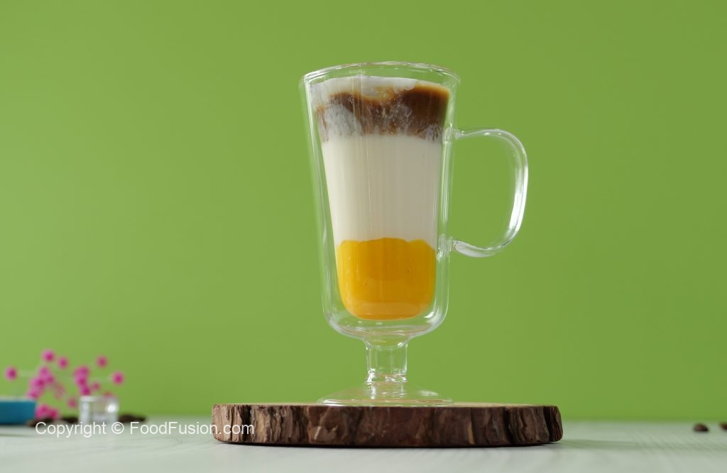 -Glass mein mango puree (2-3 tbs),ice cubes,tayyar milk mixture (1/2 Cup) aur dissolved coffee (2 tbs) dal ker ache tarhan mix ker lein & serve karein!