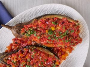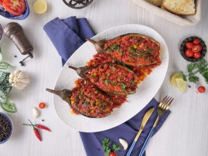 -Peel eggplants alternatively from the skin lengthways & prick with fork (don’t remove the head).