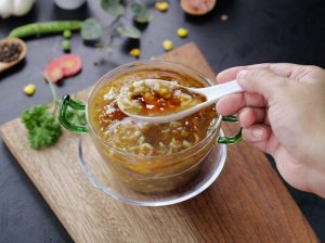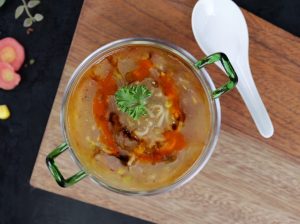 -In a saucepan add water, ½ Cup (approx. 100g) instant vegetable noodle soup mix & whisk well.