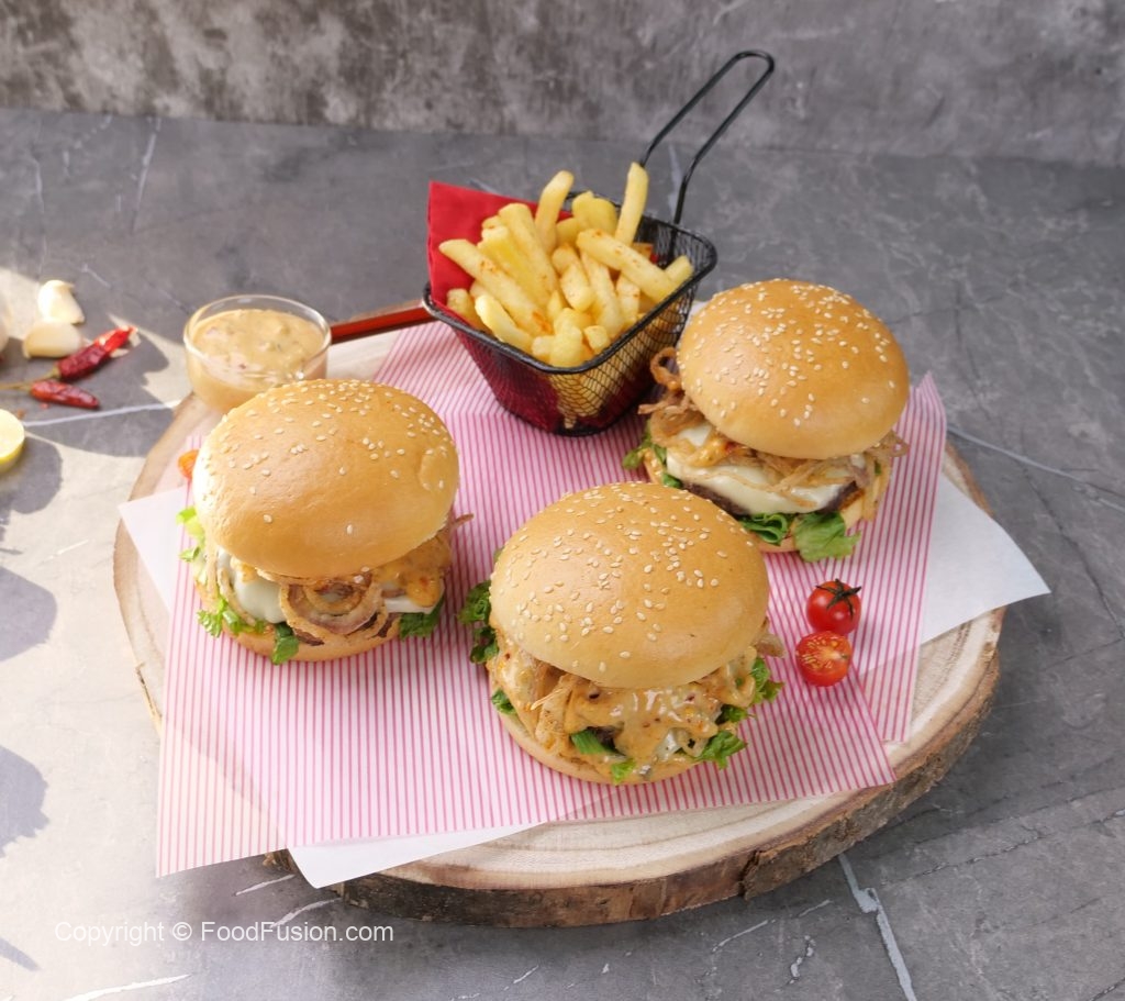 -On burger bun,add & spread jalapeno burger sauce,lettuce leaves,cheese patty,onion rings,jalapeno burger sauce & top with another bun to make a burger (makes 5).