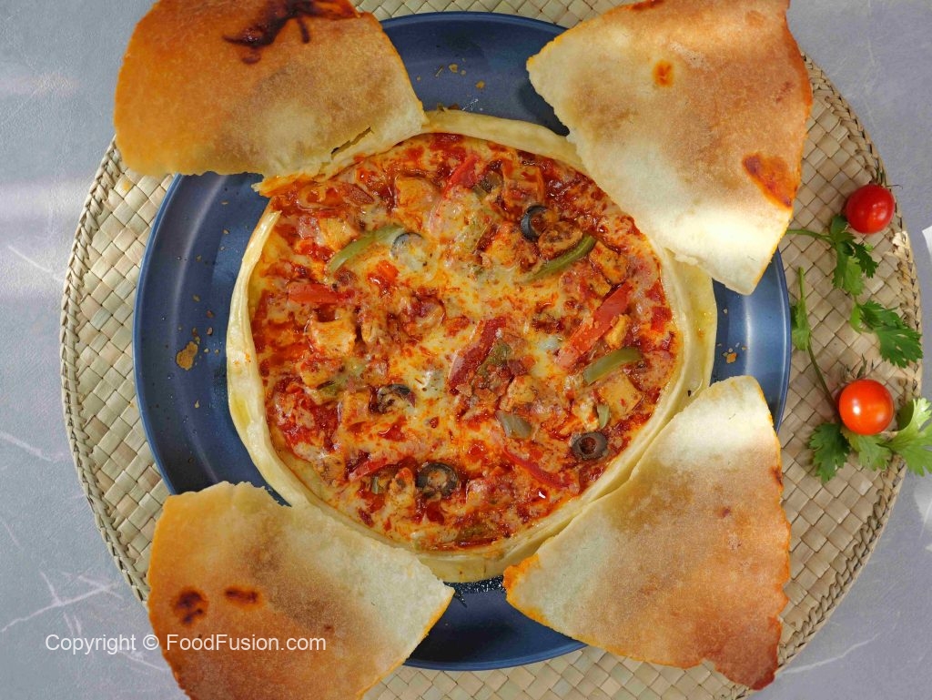 -Place rolled dough on a baking paper, add cheddar & mozzarella cheese, pizza sauce, cooked chicken, capsicum, tomato, corns, olives, jalapenos, oregano, red chilli crushed, apply water in corners, (place straw at one side of the rolled dough ensuring the tip reaches center), cover with another rolled dough (80g), gently press the corner.