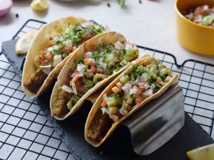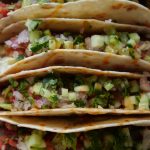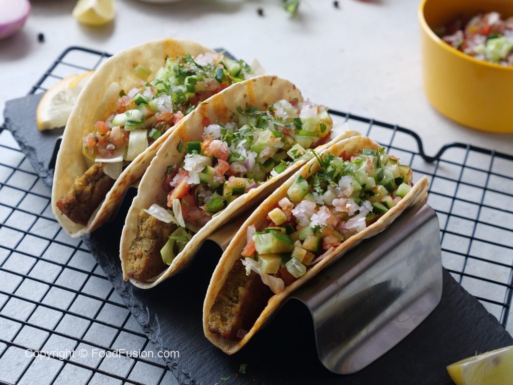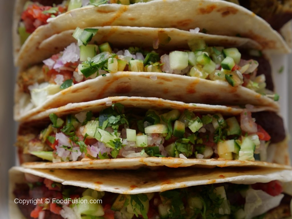 -In tortillas,add iceberg,prepared roasted tomato salsa,cucumbers,onion,fresh coriander & drizzle tabasco sauce & serve (makes 8).