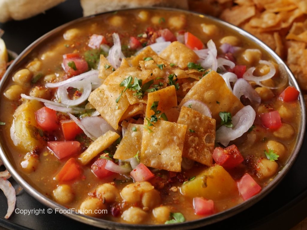 -On a serving plate,add khathiawari cholay,prepared hari chutney,tomato,chaat masala,red chilli crushed,onion,papri,fresh coriander & serve with pav buns!
