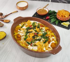 -In a serving dish,add phulkiyan,prepared dahi mixture,prepared khattay aloo,dahi mixture,green chutney,prepared tarka,papri & serve!