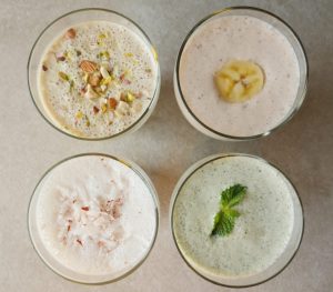 In grinder,add yogurt,ground nuts,dates (deseeded),raisins,salt,milk,ice cubes,honey and blend until well combined.