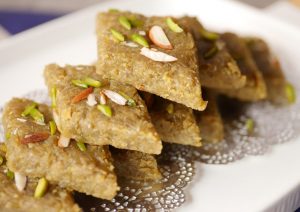 Mithai ki consistency check karne k liye aik chota si quantity len or ball banayen. Agar ball smooth banay to mithai ready hai.