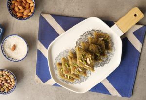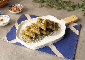Cut in pieces, garnish with pistachios & almonds.