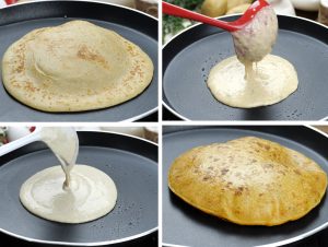Ladle ki madad sa tayyar batter dal ker evenly spread ker lein aur halki ancch per color change ho janay tak paka lein phir flip karein aur bech mein oil/ghee laga lein (makes 6).