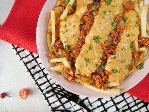 -On a serving dish,add potato fries,prepared hot chicken filling,caramelized onion,cheddar cheese, mozzarella cheese & air fry at 180°C until cheese melts (3-4 minutes).
