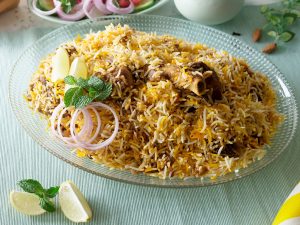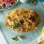 Add reserved mutton,fried onion,remaining spice mix,boiled rice and prepared saffron milk,cover and simmer on low flame for 8-10 minutes & serve!