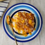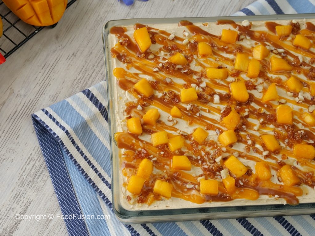 -Drizzle prepared butterscotch sauce,prepared almond crunch,mango chunks,prepared butterscotch whipped cream & spread evenly.