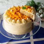 Add & spread mango frosting and frost the outside of the cake with mango frosting.