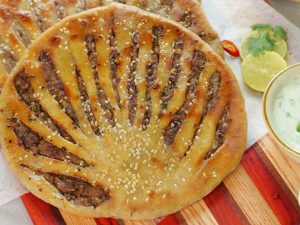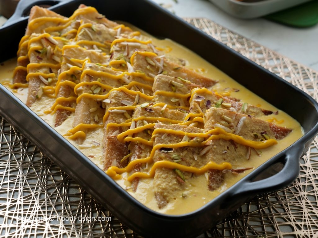 Serving dish mein bread slices rakhd ein,khopra,tayyar mango milk syrup,pista,badam aur tayyar mango & cream sauce dal dein aur thanda serve karein!