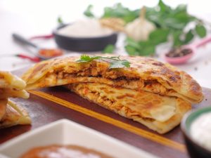 -On one rolled dough, spread mayonnaise, prepared chicken filling, mix cheese, prepared hot mustard sauce (1 tbs) & place another rolled dough over it & seal properly.