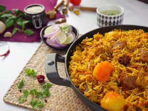 -Orange food color aur fried pyaz dal kar kitchen cloth aur lid se dhak dein aur low flame par 10-12 minute kliya steam cook ker lein.