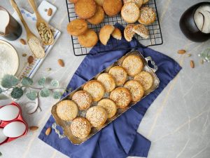 -In a bowl,add all-purpose flour,almond powder,sesame seeds,cardamom powder,semolina & mix well.