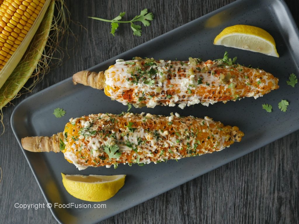 Brush corn with mayonnaise+ cream,spinkle feta cheese,red chili powder,paprika powder,jalapenos, fresh coriander and squeeze lemon juice.