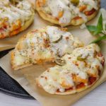 -Turn off the flame,on cooked naan,add & spread pizza sauce,add cooked chicken,prepared alfredo sauce,cheddar cheese,mozzarella cheese,pickled jalapenos,sprinkle red chilli crushed & dried oregano,cover,turn on the flame & cook on low flame until cheese melts (3-4 minutes).