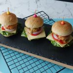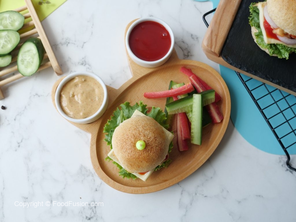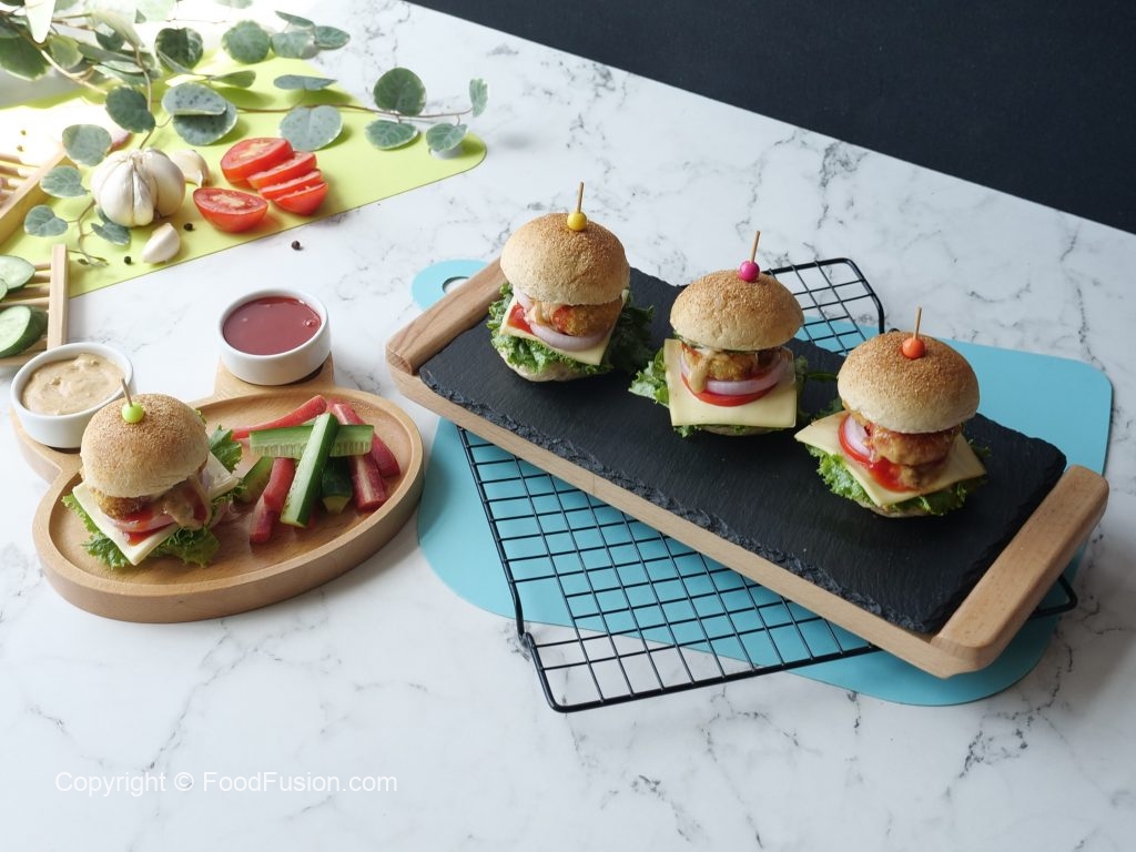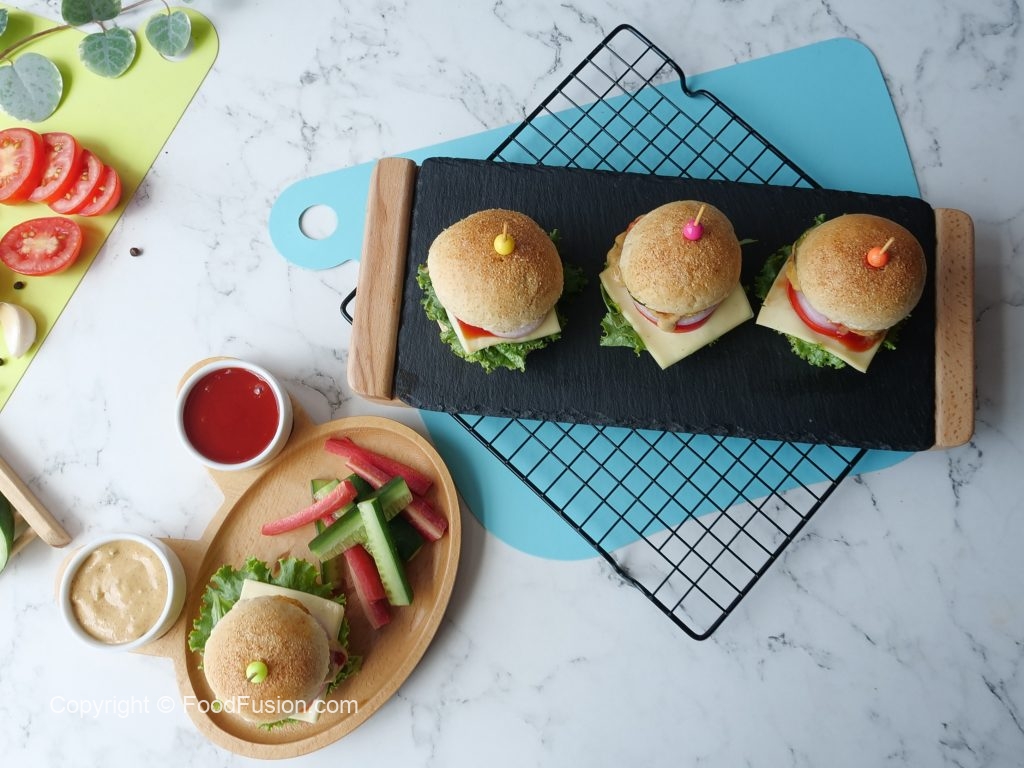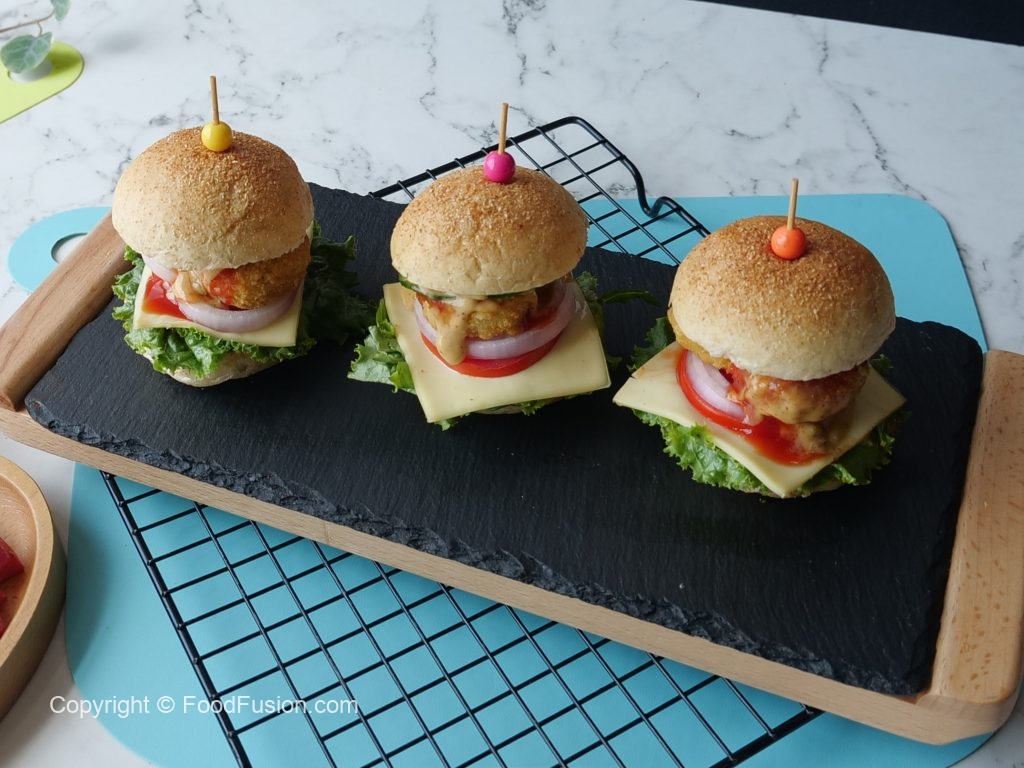 -Cut smini burger buns from center,add & spread prepared burger sauce,lettuce leaf,cheese slice,tomato slice,onion rings,fried chicken nugget,cucumber slices,tomato ketchup,burger sauce and top with another mini bun to make a burger (makes 8-10).