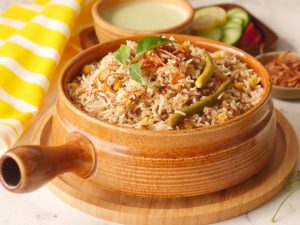 In pot,add half quantity of boiled rice,meat balls with gravy,mint leaves,fresh coriander and remaining quantity of boiled rice.