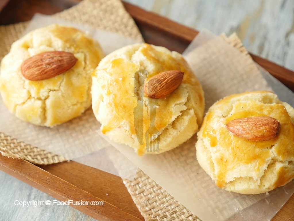Baking plate/tray per butter paper laga lein aur nan khatai balls rakh dein,ande ki zardi aur roasted badam laga lein.